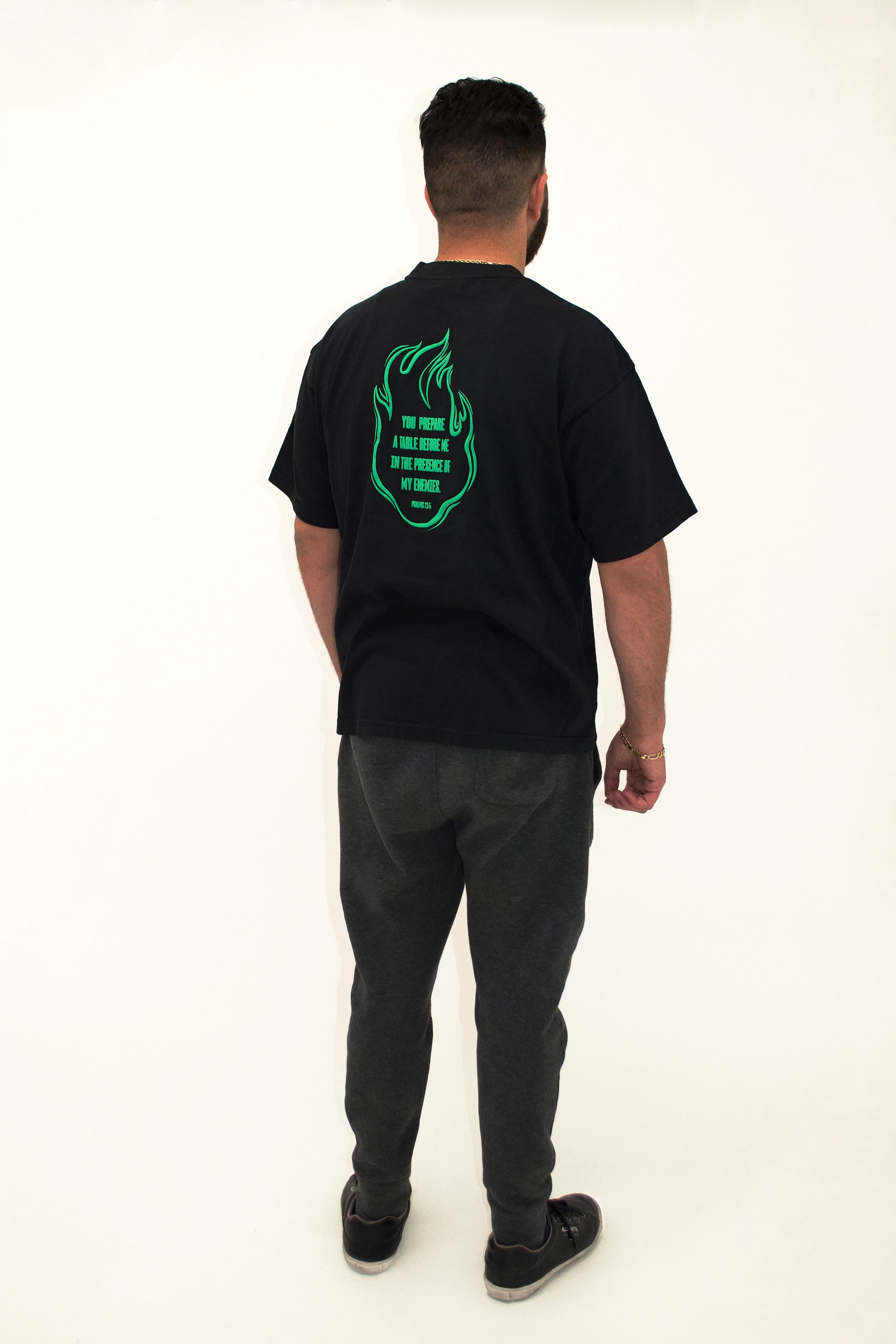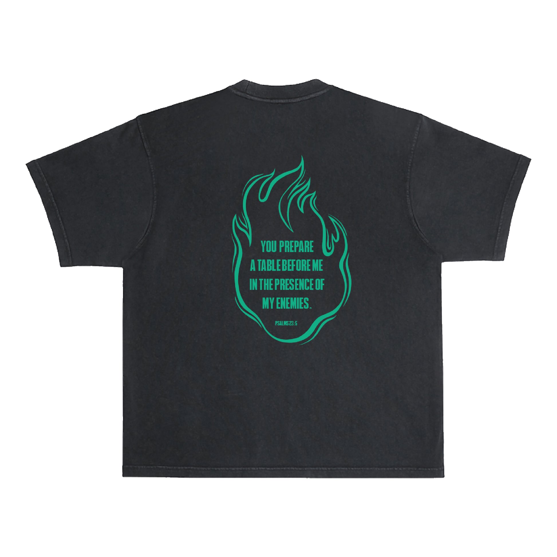 "You prepare a table before me in the presence of my enemies." Green Fire tee has Psalms 23:5 in puff print on the back and MK inside a green flame on the front.
