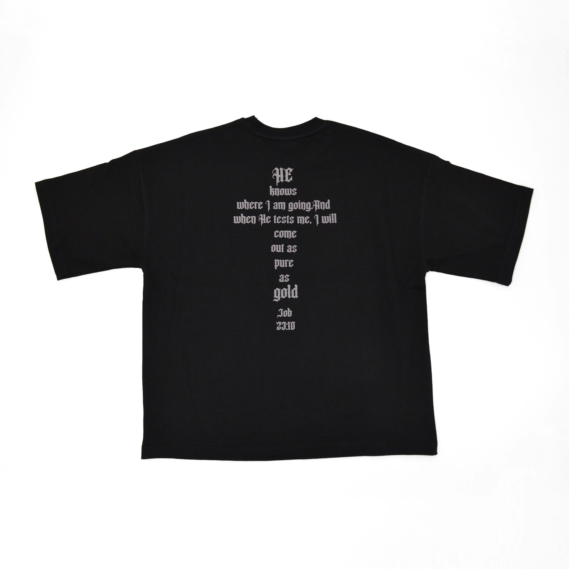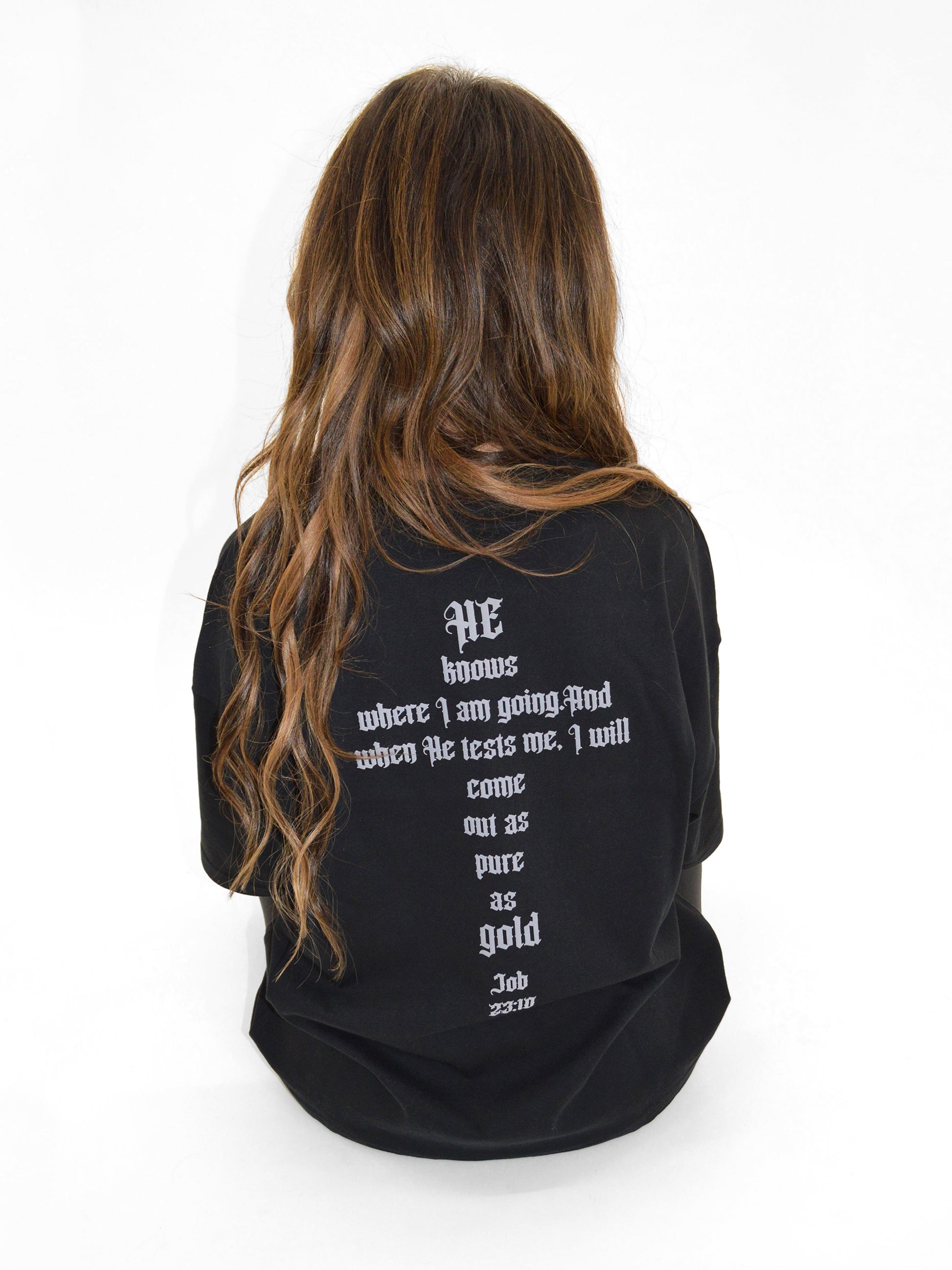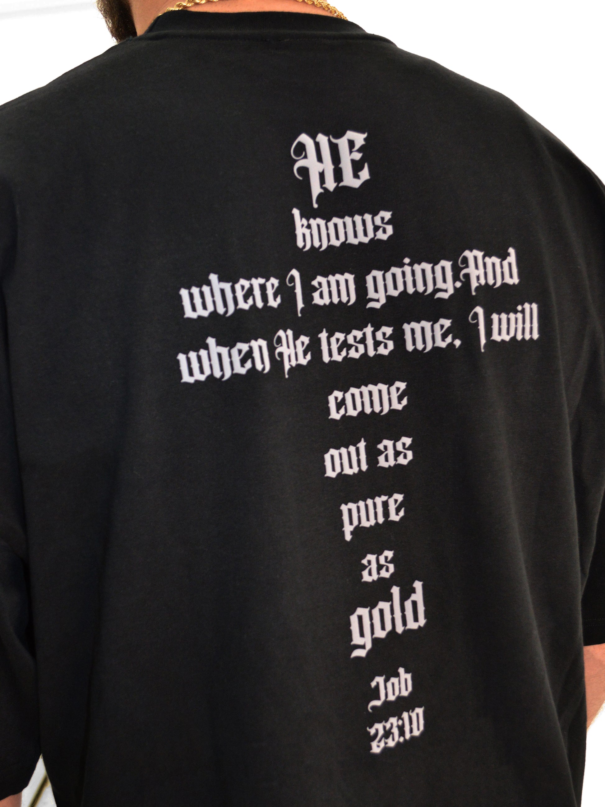 "He knows where I am going. And when He tests me, I will come out as pure as gold." Puff print of Job 23:10 on the back and Heart Of Gold embroidered art on the chest.