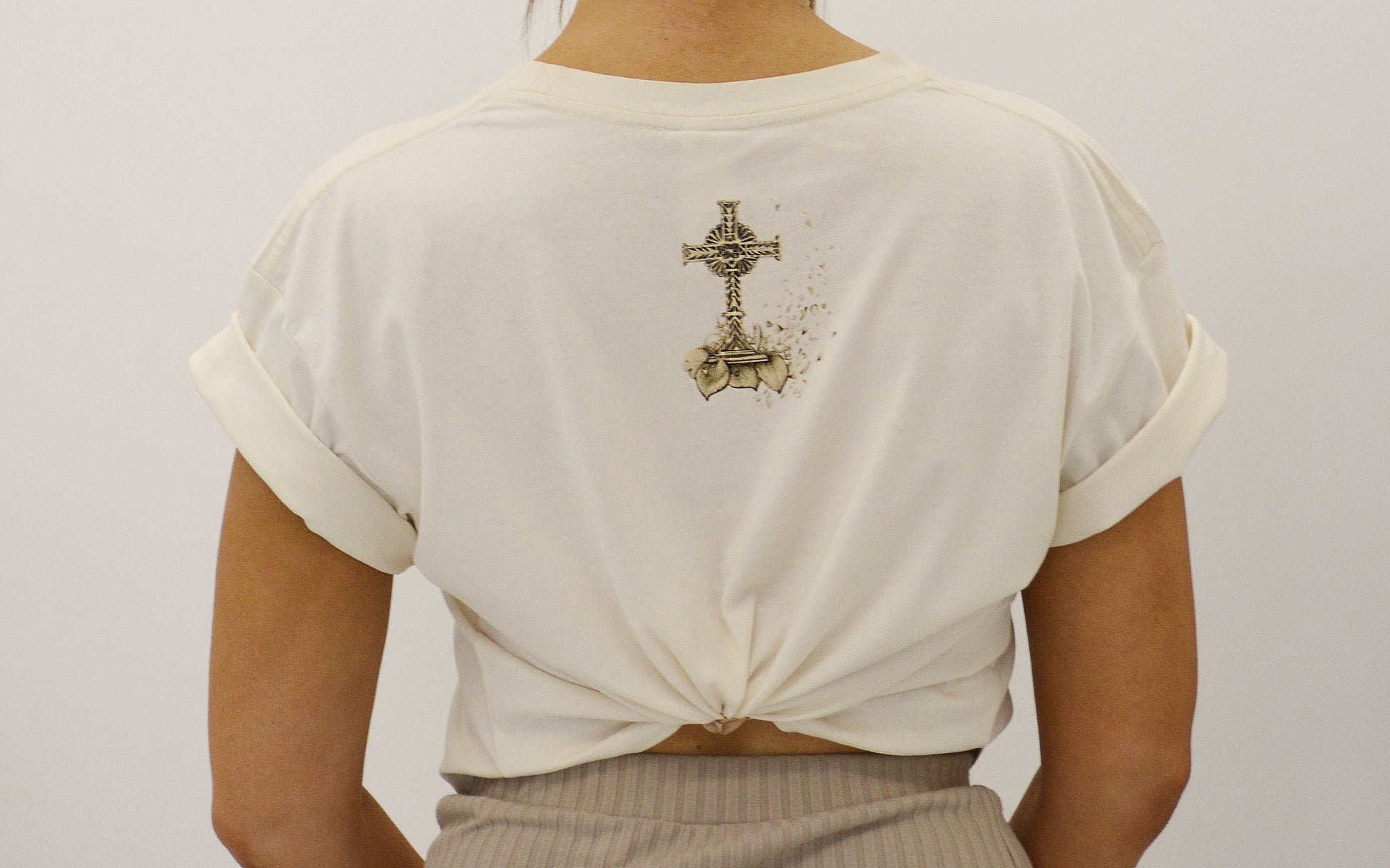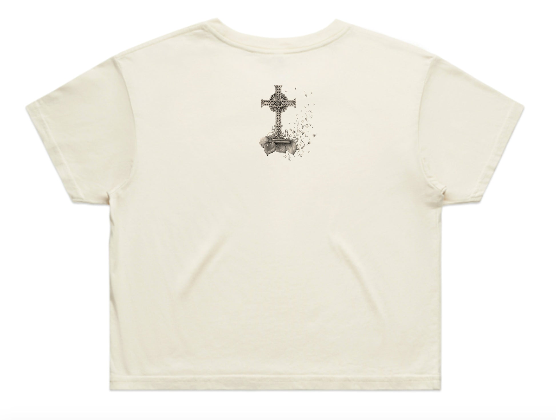Introducing Pray crop tee! The front print is of an original graphite drawing titled "Pray". The back print is an illustration of an Armenian khachkar titled "One Truth".